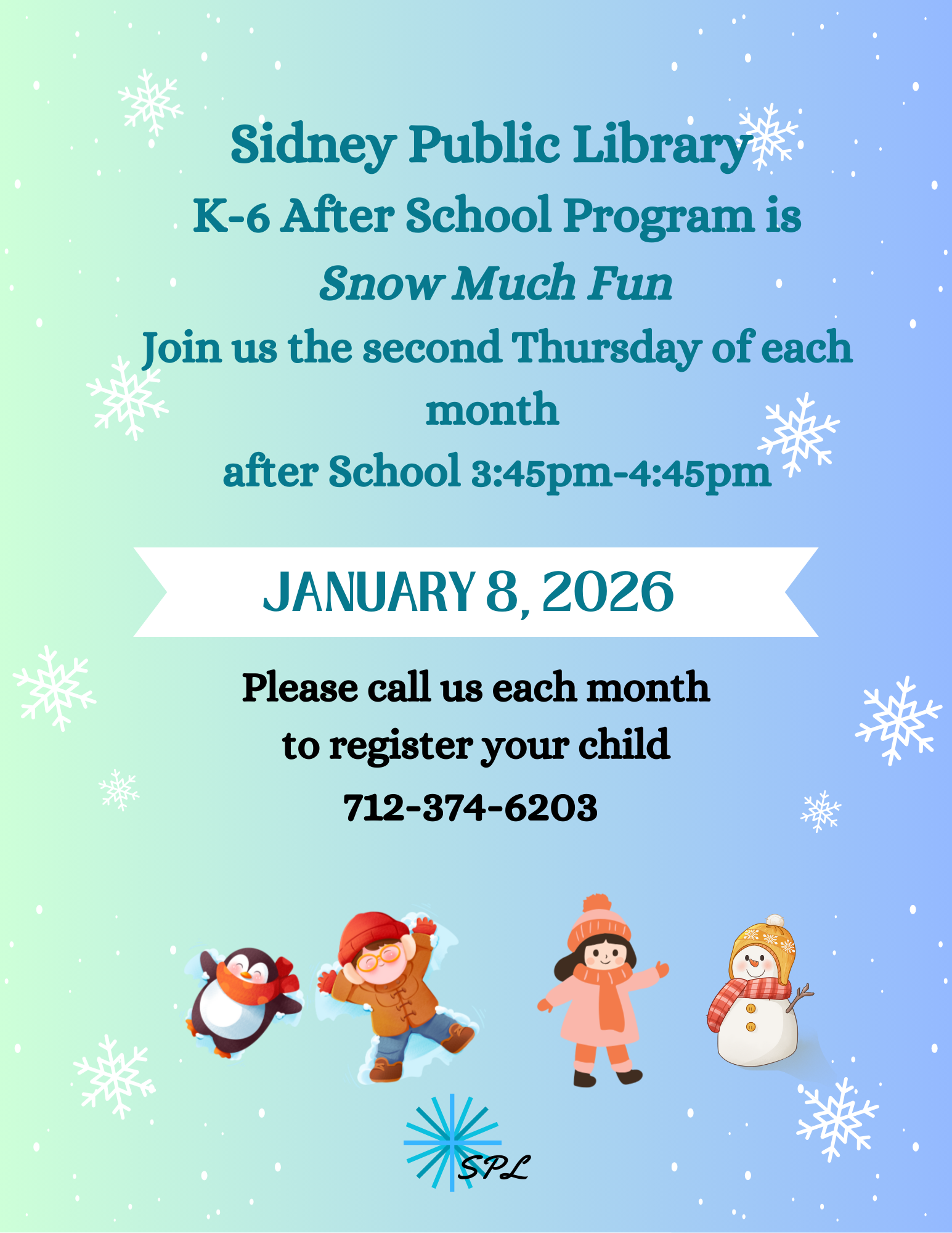 Registration for the Library's After School Program is recommended in order to insure we have enough supplies. Please call the library at 712-374-6203 to register your child.