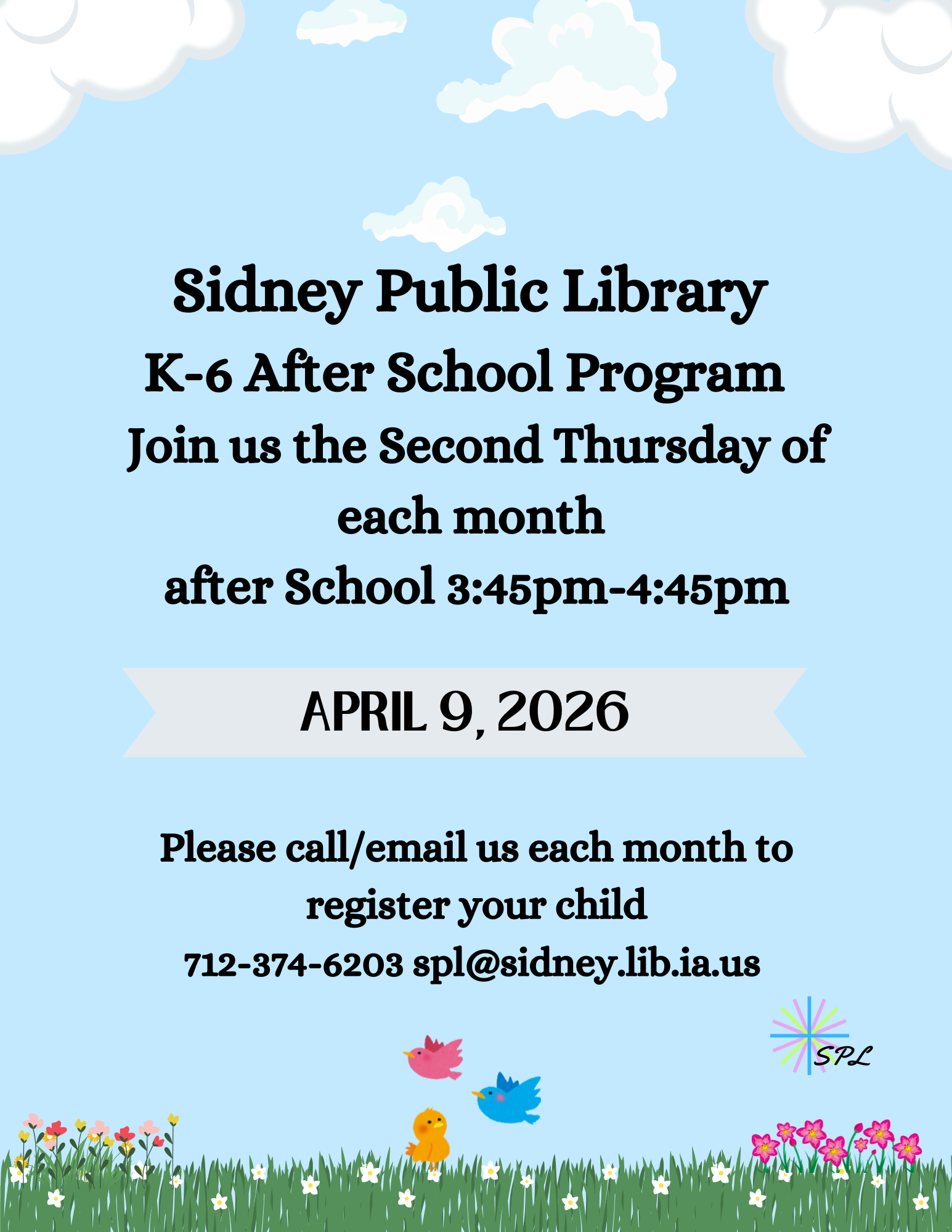 Registration for the Library's After School Program is recommended in order to insure we have enough supplies. Please call the library at 712-374-6203 to register your child.